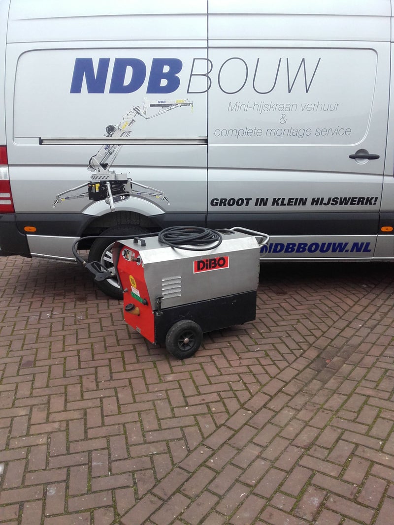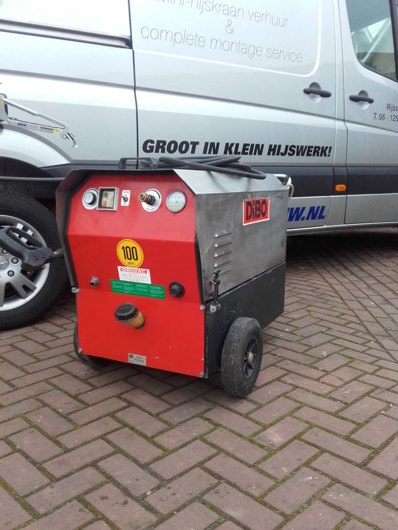 Onze krachtige hogedrukreiniger van DIBO die op 220V ( 16 A ) werkt en 100 bar levert is schoonmaken van uw spullen geen problemen.